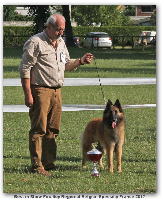 - CR, Best of Breed and BEST IN SHOW Regional Belgian Shepherd Specialty Fouilloy, France July 2017 judges Mme Berton-Sarlat (Tervuerens), Mme Berton-Sarlat, Brice Roise, Mme Varlet (Best in Show)