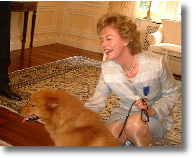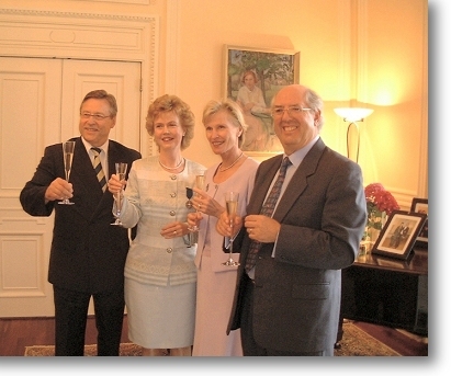 Nykyistä suurlähettilästä Pertti Salolaista Angela kehuu vuolaasti sanoen tämän olevan todella tehokas ja maataan hyvin esille tuova. Hän on tavannut aikaisemmatkin suurlähettiläät, ja Salolainen vie hänen mielestään näistä kirkkaasti voiton. Kunniamerkkitilaisuuden piti olla tietenkin arvokas, vakava ja juhlallinen, kuten Suomessa on tapana, mutta se meni varsinaiseksi hihittelyksi. Suurlähettilään piti kiinnittää merkki Angelan rintaan sen takapuolella olevilla neuloilla, mutta koska neulat ovat pitkiä ja teräviä, piti tietenkin varoa, ettei merkinsaajaa niillä tökätä. Siinäpä olikin tuhertamista, ja kesti ainakin viisi minuuttia, ennen kuin Salolainen sai merkin säädyllisesti kiinnitettyä. Tilaisuutta kunnioitti luonnollisesti läsnäolollaan myös suomenpystykorva, Angelan kasvatti Ch Toveri Armaani.