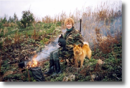 - Kun tulin ensimmäistä kertaa Suomeen, tapasin useita pystykorvien omistajia. En ollut vielä silloin "sisällä" asioissa, mutta pidin kaikesta näkemästäni ja kokemastani. Etenkin tutustuminen Eero Häkkiseen oli merkityksellistä. Vuotta myöhemmin tulin uudestaan, ja halusin päästä näkemään metsästystä. Muistan vieläkin aivan elävästi, kuinka koira istui autossa kaikessa rauhassa, mutta sitten kun se päästettiin irti metsään, se aivan kuin syttyi ja pääsi oikeuksiinsa. Suomenpystykorvan luonnetta on mahdotonta ymmärtää, ellei sitä näe oikeassa elementissään, metsällä. Muutenkin kaikki se, etenkin aamun valo, metsän tuoksu ja hiljaisuus, teki lähtemättömän vaikutuksen. Ymmärrän hyvin, että metsä on suomalaiselle pyhä, kuin kirkko, Angela sanoo.